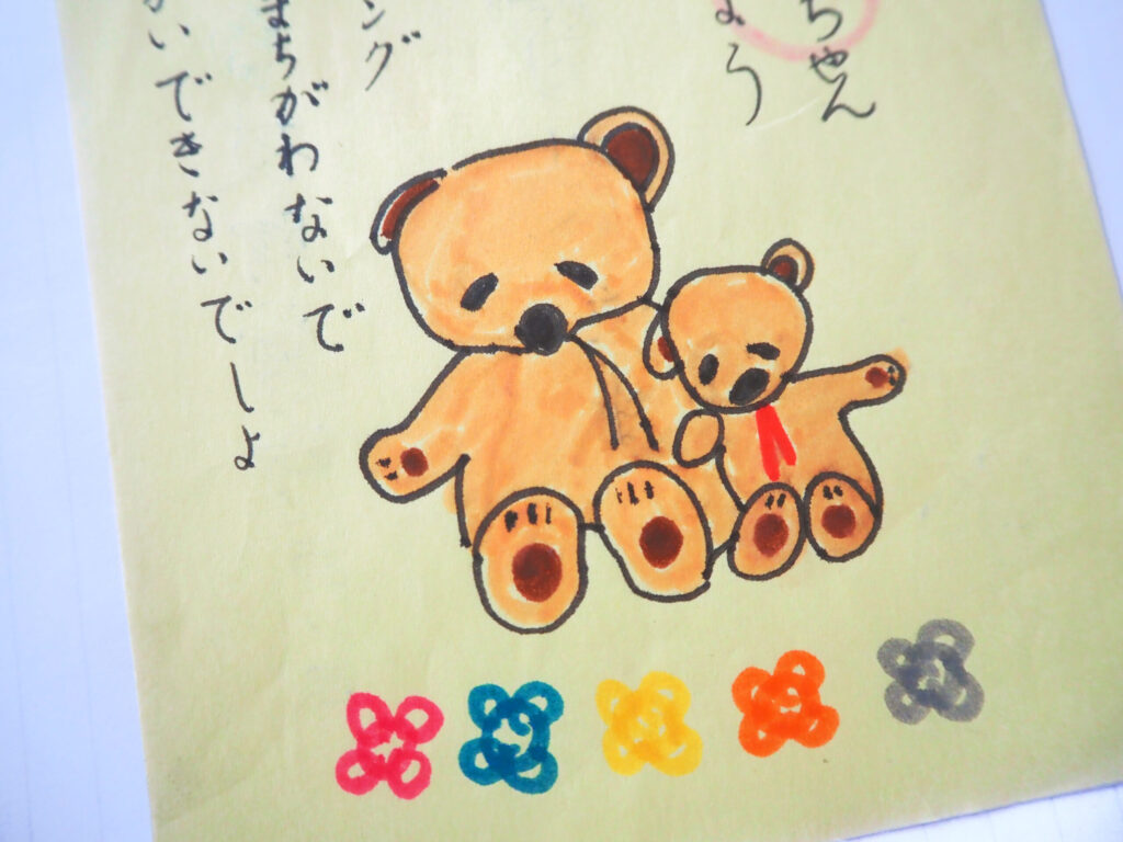 The colorful five-ring pattern drawn beneath the bears is a toy called “Chae-ring,” which was popular in Japan during the Showa era.