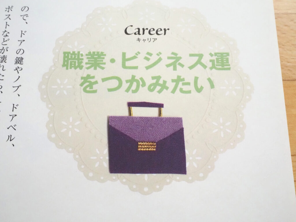 「職業・ビジネス運をつかみたい」という小見出しのエリアには、ビジネスバッグのモチーフがレ、レース模様の背景にレイアウトされていました。